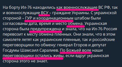 В поддержку версии о обмене пленными несколько провластных телеграм-каналов сообщили, что обмен пленными "по формуле 192 на 192" якобы должен был состояться сегодня на границе Белгородской области, но "ВСУ сорвали его атакой на Ил-76". Депутат Картаполов также заявил в Госдуме, что самолетов было два: еще один якобы летел за сбитым Ил-76 с 80 военнопленными, но его "успели развернуть".