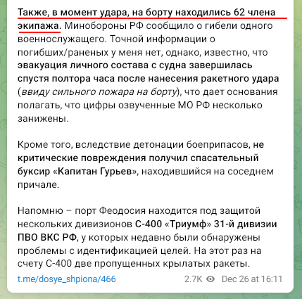"Досьє шпигуна" повідомляє про 62 члена екіпажу на борту під час атаки