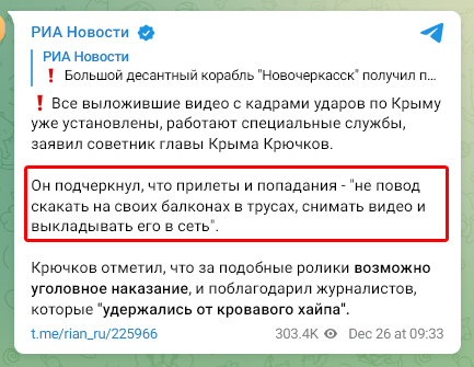 «Корабель перебував у військовій гавані 31-го науково-випробувального центру, з полігона якого якраз і запускаються Shahed по наших містах і селах. Командувач Повітряних сил Олещук сказав, за його даними саме якраз Shahed і пускові до них перевозив в цьому рейсі російський десантний корабель».