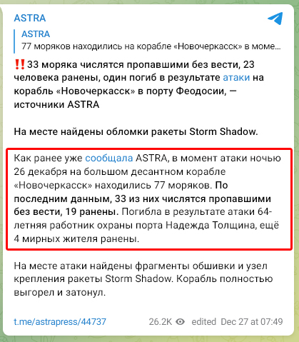 ASTRA: На борту ВДК Новочеркаськ під час атаки перебувало 77 моряків, 33 зникли безвісти, поранено 19, 1 цивільний працівник порту загинув, 4 поранені