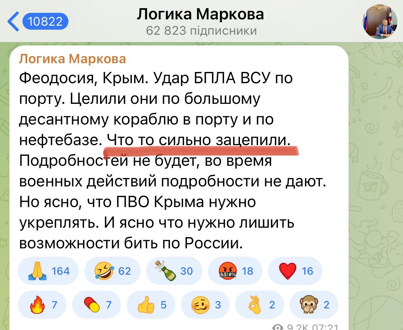 Т.зв. "голова Криму" Аксьонов і його підручні поспішили зазначити, що корабель лише "зазнав пошкоджень", а два винищувачі ЗСУ, які випустили ракети, нібито були успішно вражені силами ППО РФ: