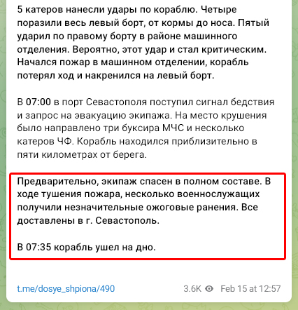 14 лютого 2024 ЗСУ разом з ГУР надводними дронами-камікадзе потопили Великий Десантний корабель "Цезар Куніков", хоч уряд і МО РФ офіційно продовжують мовчати, російські мережі вже визнали втрату корабля, та обговорюють долю екіпажу- що з ним?