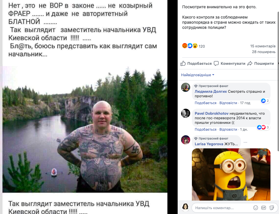 У 2014 році кремлівські пропагандисти в соціальних мережах поширювали це й подібні йому повідомлення, мовляв: "дивіться до чого докотилися "майдануті" - заступником начальника київського главку МВС призначили прихильника і послідовника нацизму! Якщо вже начальство міліції розтатуйовані свастикою скінхеди, то що очікувати від особового складу посадами нижче?!"