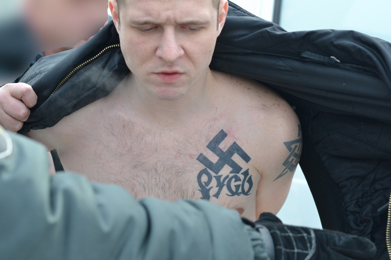 Це скінхед з Петербурга. Насправді на фото відомий у петербурзьких радикальних колах Олексій Максимов (прізвиська – «Муха» та «Борман»).