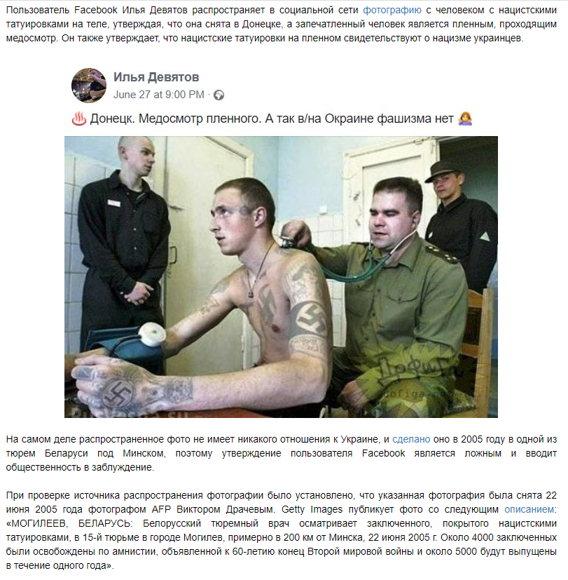 Але аналіз походження фото показав, що фотографії "розтатуйованих" в'язнів не мають жодного відношення ні до Азова, ні до України. На фото - члени кримінального угрупування із Сальвадора...