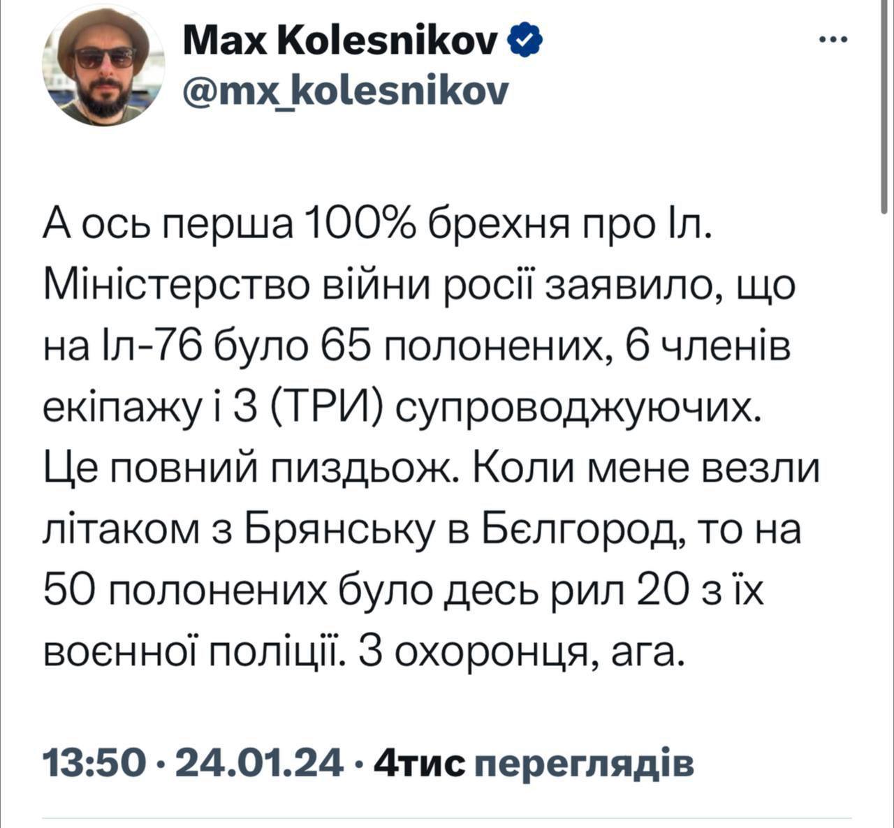 Бывший украинский военнопленный Макс Колесников, так прокомментировал сообщения рос СМИ о пленных на Ил-76: