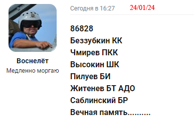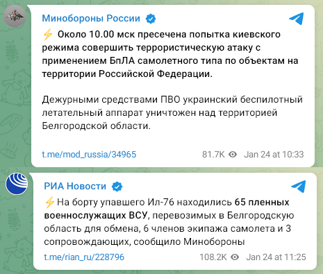 Утром 24 января 2024 в Белгородской области РФ был сбит военно-транспортный самолет Ил-76. Россияне утверждают, что на борту, кроме членов экипажа, были украинские военнопленные, которых транспортировали для обмена военнопленными. Украинская сторона информацию не подтверждает, допускает, что самолет ВКС РФ перевозил ракеты С 300, которыми армия РФ обстреливает Украину.