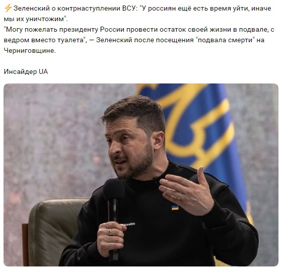 Посетив освобожденный от русских весной прошлого года населенный пункт, где люди прятались в подвалах, скрываясь от оккупантов, Зеленский пожелал Путину «провести остаток своей жизни в подвале с ведром вместо туалета».